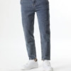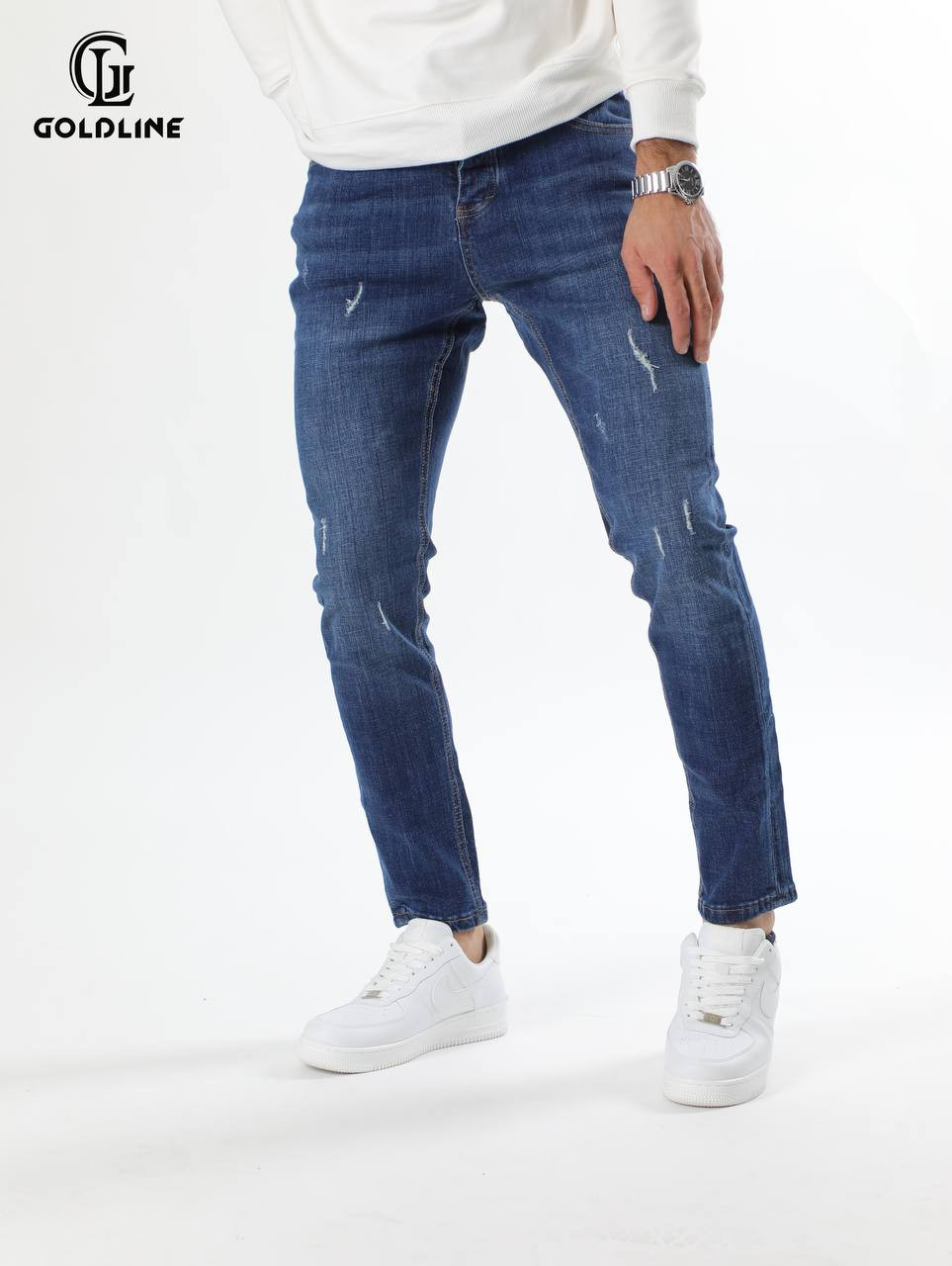جينز رجالي بقصة ضيقة جداً ولون داكن يبرز بلمسات تمزيق واضحة، مما يمنحه مظهراً عصرياً وجريئاً يتناسق مع الحذاء الرياضي الأبيض.