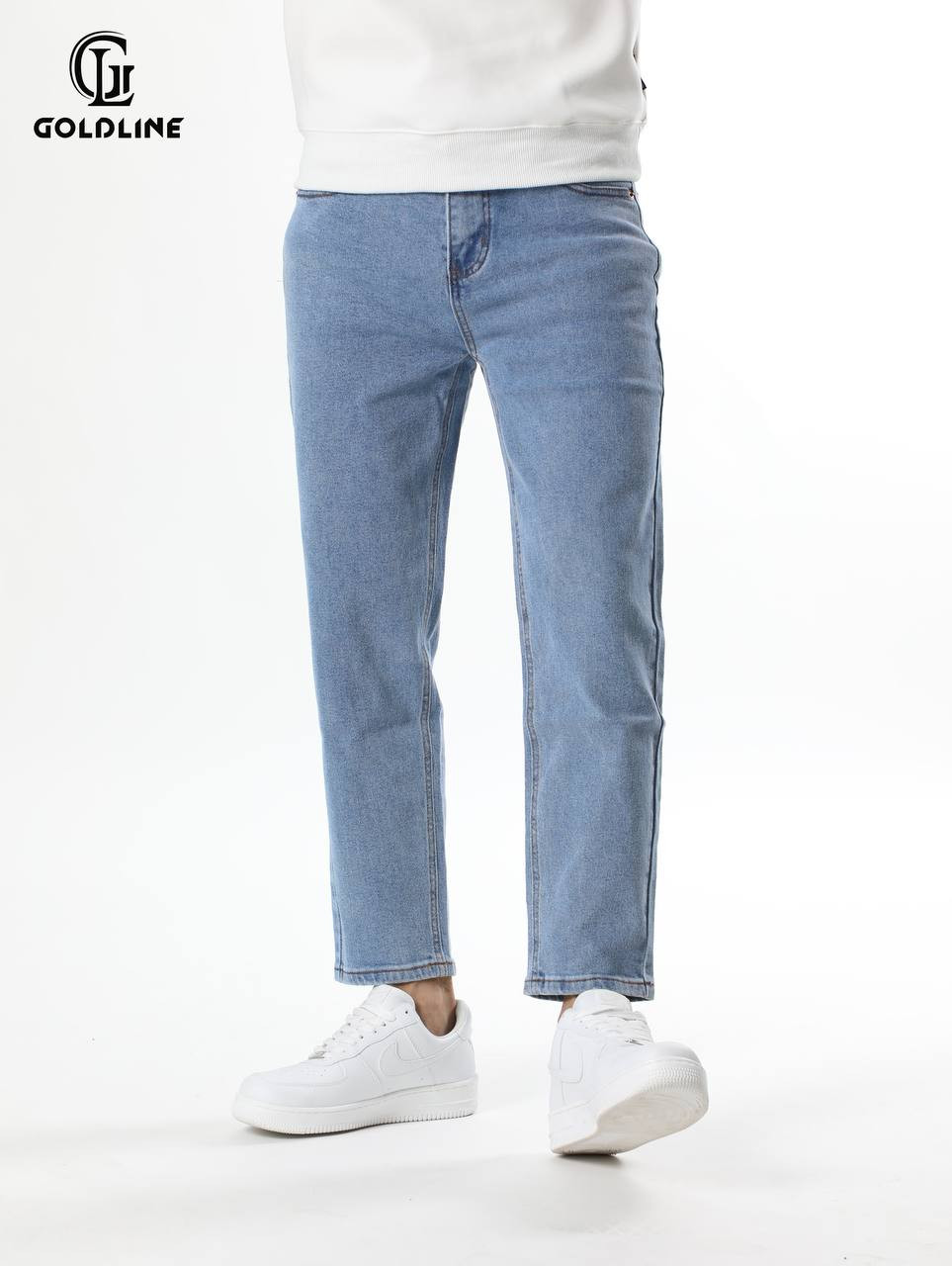 Classic men’s light wash straight-fit jeans featuring a contemporary cropped ankle length, perfectly styled with clean white sneakers for a casual summer look.