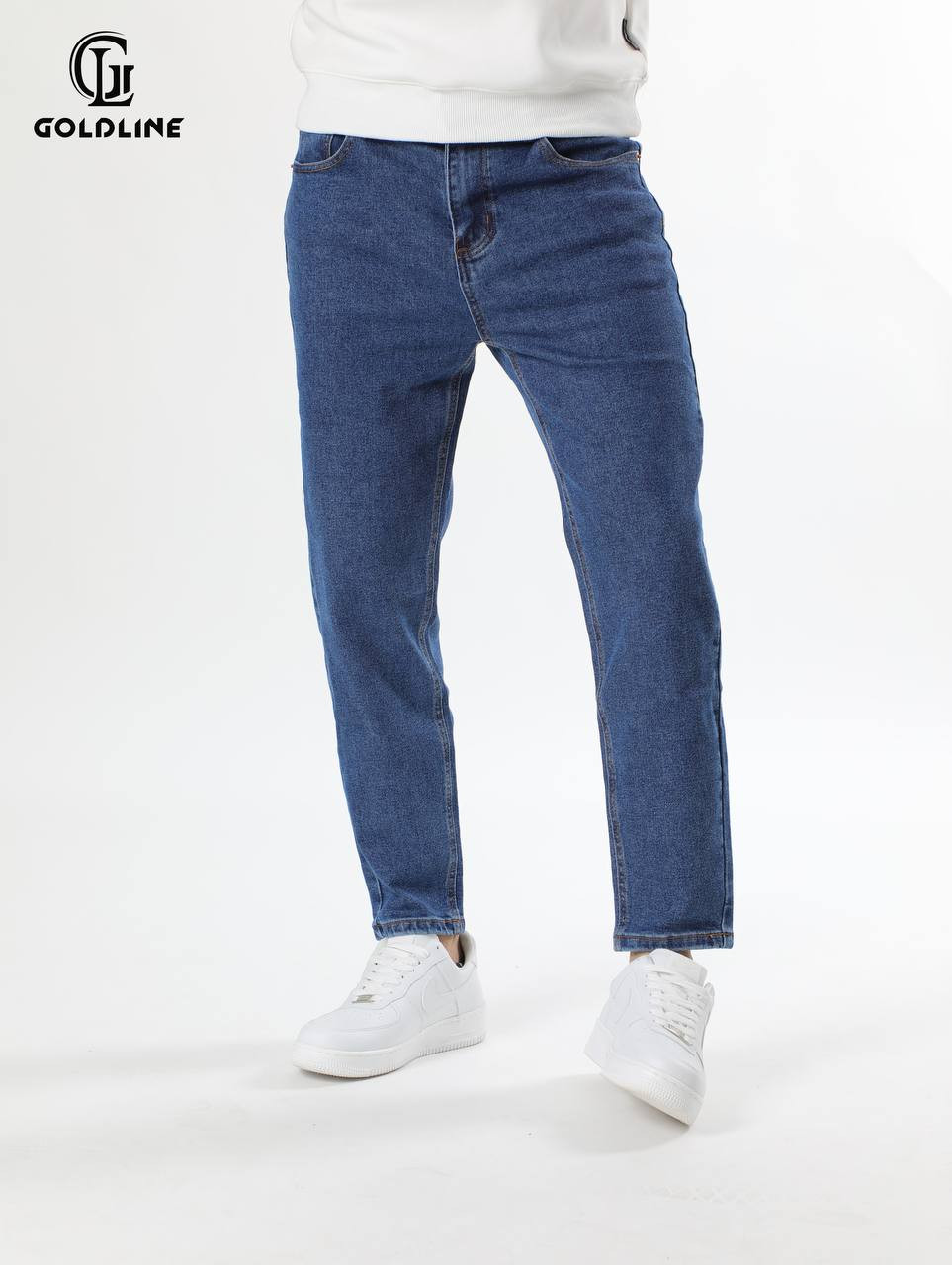 جينز رجالي بلون أزرق متوسط يتميز بـقصة مستقيمة ومريحة توفر مظهراً كلاسيكياً ومتعدد الاستخدامات للارتداء اليومي.