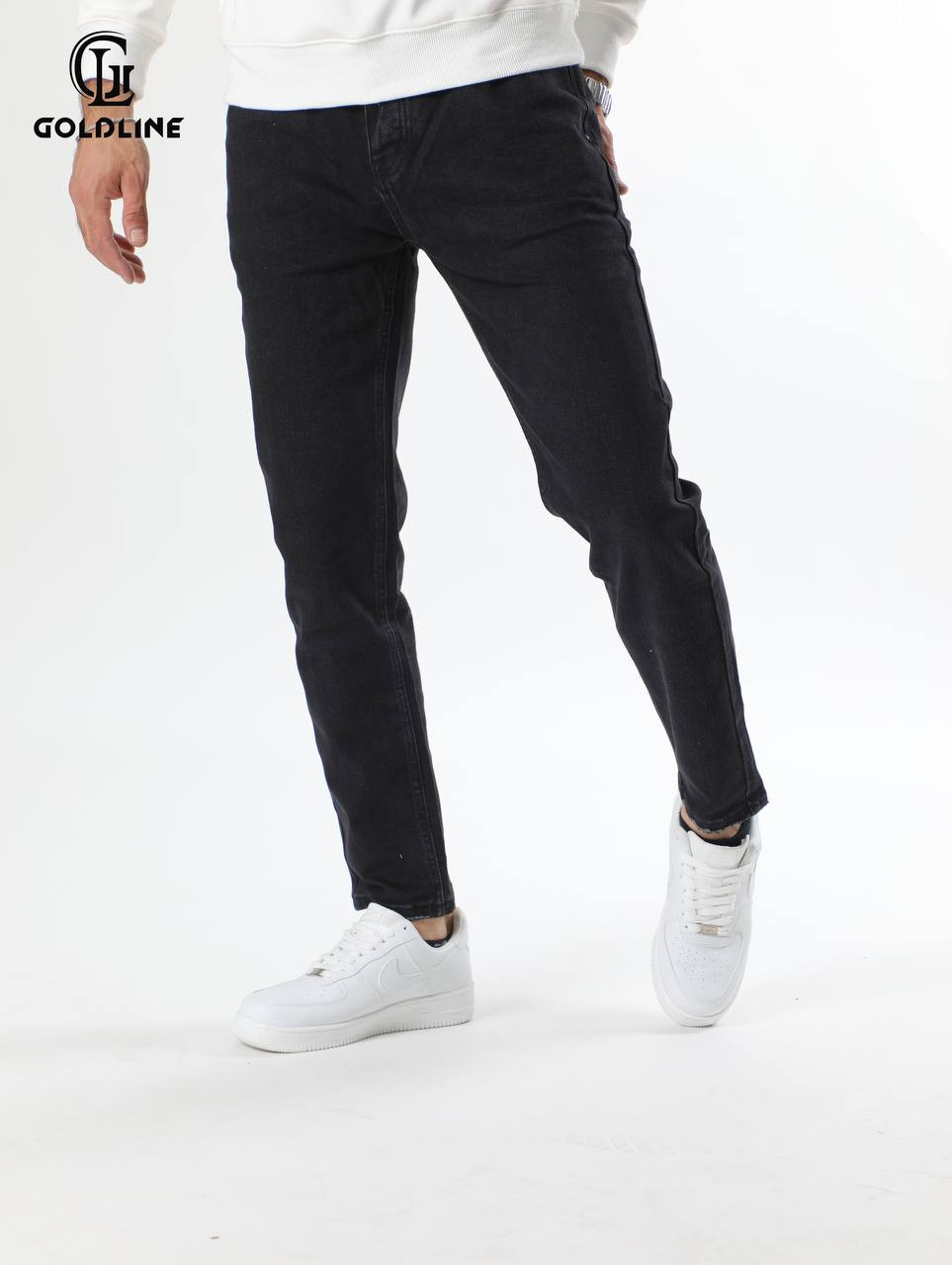 جينز رجالي أسود سادة يتميز بـقصة ضيقة جداً ومحددة، ويوفر مظهراً نظيفاً ومتعدد الاستخدامات، مثالي للمناسبات الكاجوال أو شبه الرسمية.