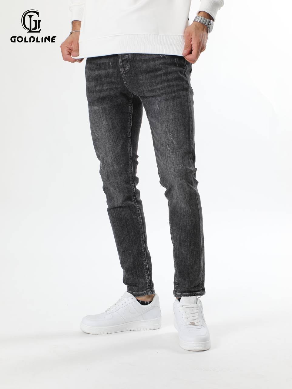 جينز رجالي بلون رمادي فاحم ومغسول يتميز بـقصة ضيقة جداً ولمسة باهتة قليلاً، مما يمنحه مظهراً عصرياً وداكناً بديلاً للدنيم الأسود.
