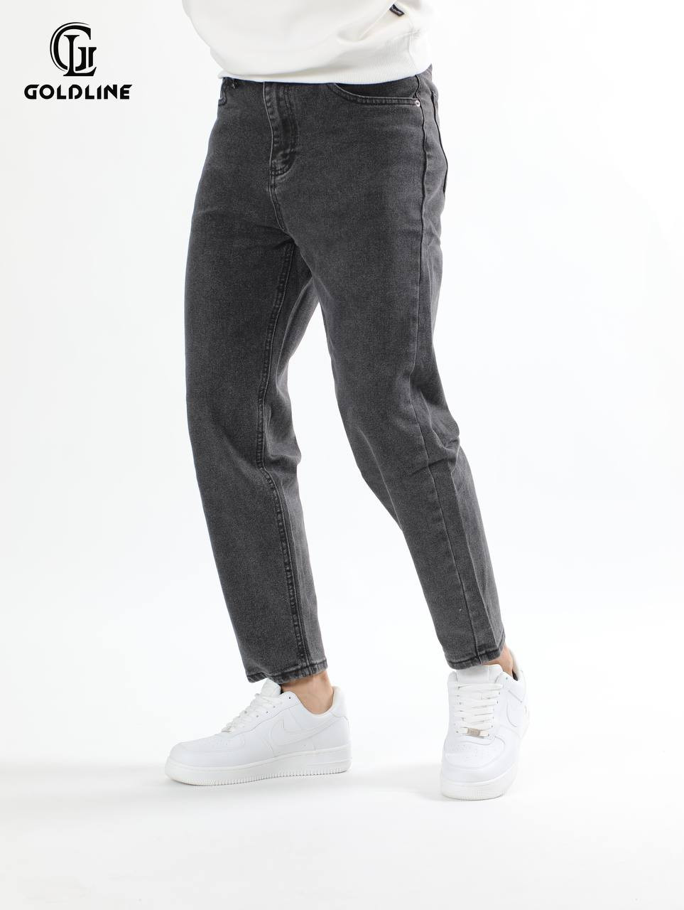 جينز رجالي بلون رمادي فاحم ومغسول يتميز بـقصة فضفاضة ومريحة وطول عصري يصل إلى الكاحل، مما يمنحه مظهراً مريحاً وجريئاً.