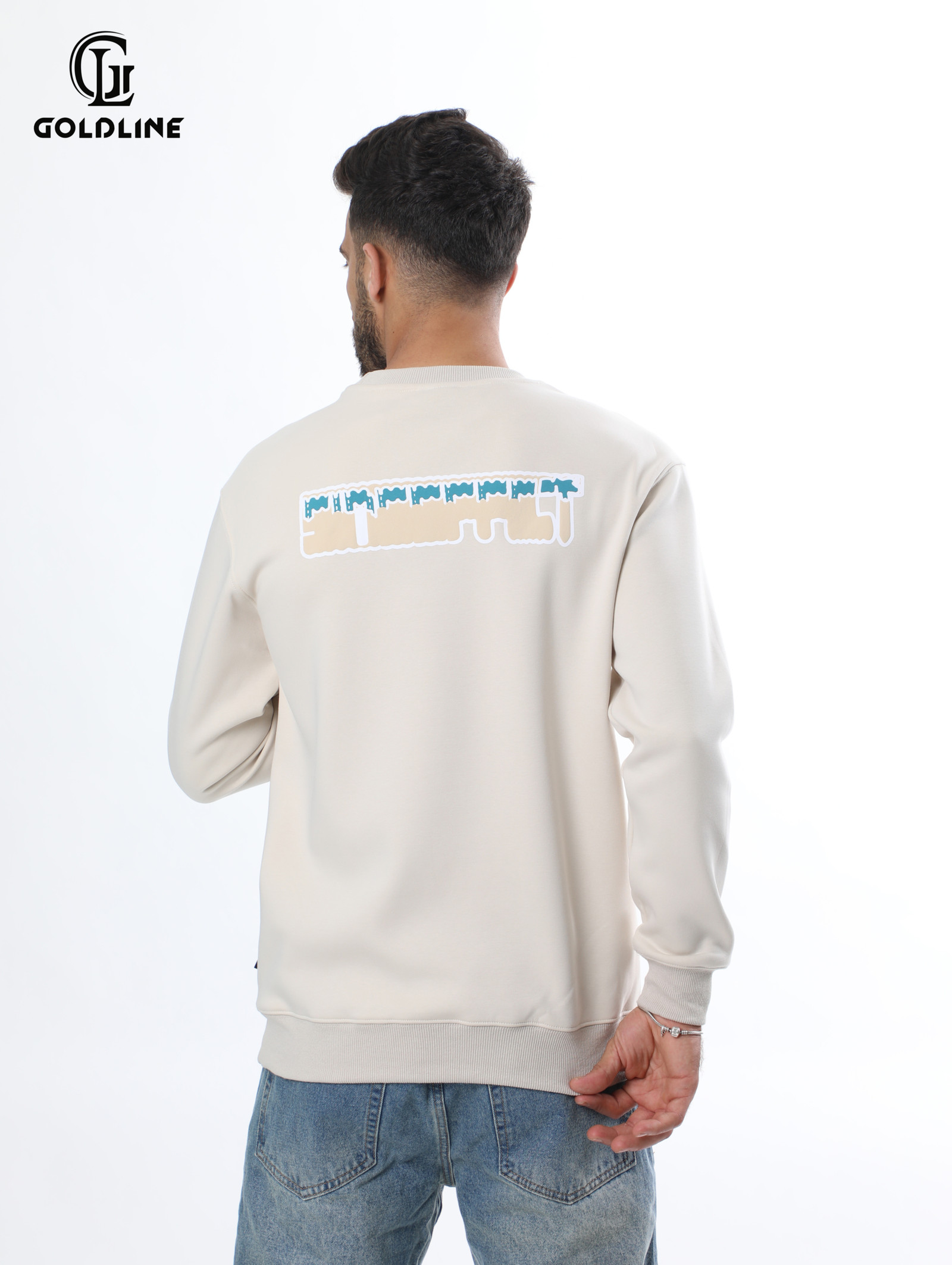 basic design sweater with heavy lining, writing on the chest and the back.