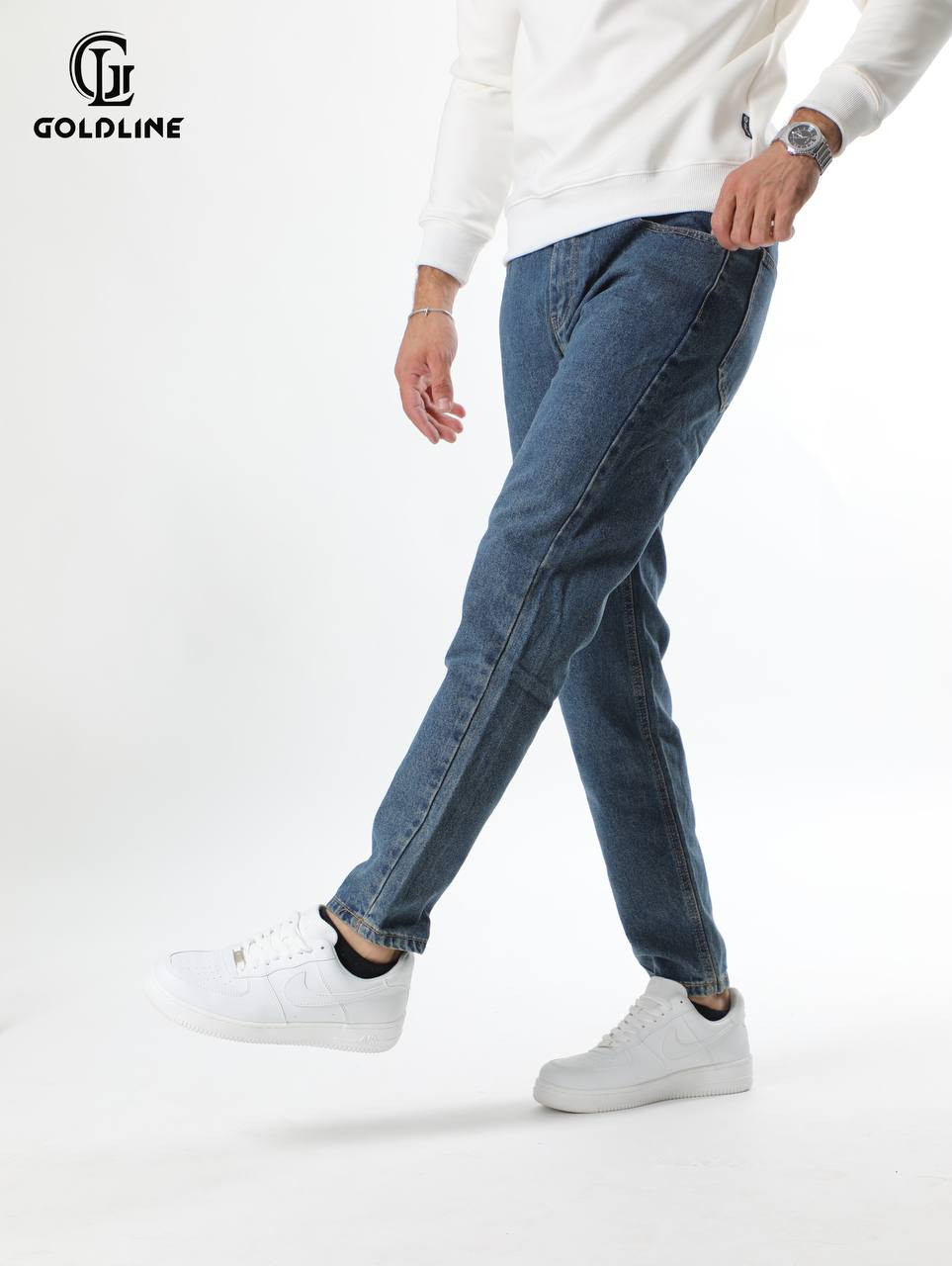 بنطلون جينز بقصة مخروطية وغسلة متوسطة داكنة، يوازن بين الراحة والمظهر الأنيق عند الكاحل.