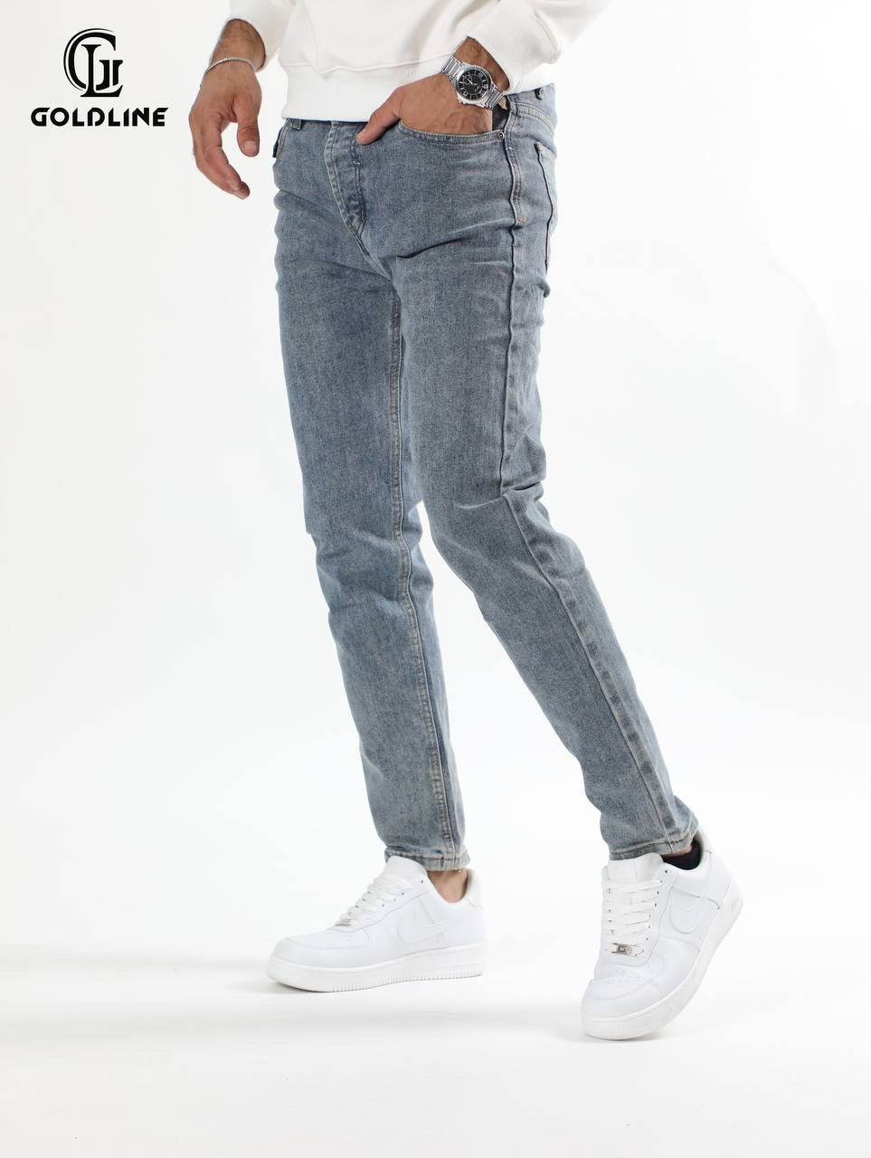 جينز رجالي باللون الرمادي الفاتح المغسول يتميز بـلمسة باهتة عصرية وقصة ضيقة ومحددة، مما يمنحه مظهراً أنيقاً ومختلفاً عن الدنيم الأزرق.